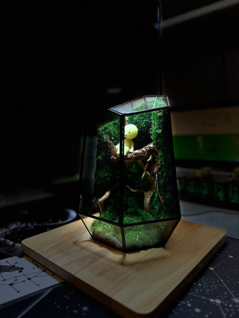 A beautifully crafted preserved terrarium featuring natural driftwood and adorable Smiski figurines. This low-maintenance decor piece combines lush preserved moss and woodsy charm with distinctive Smiski, creating a unique, elegant display perfect for any space.